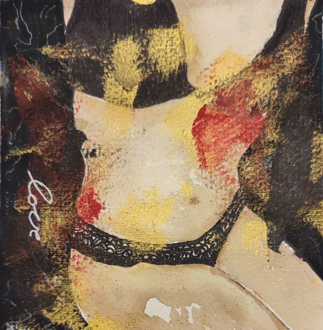 Schwarze Tinte, Perfekte Outlines, Acryl, Ölpastell, Graphit und Aquarell gern auch kombiniert mit unorthodoxen Materialien wie Printmedien und Blattgold.